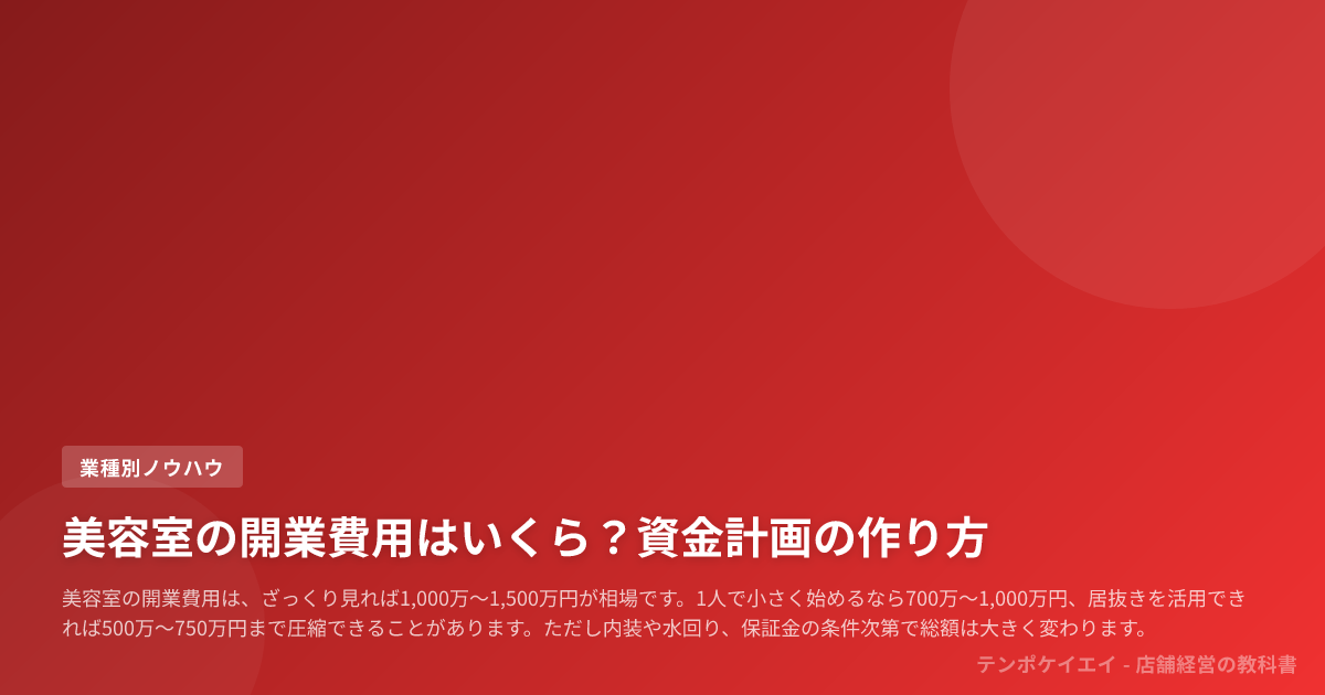 小規模店舗の開業支援を続けていると、業種が飲食でも小売でも美容でも、赤字の主因はだいたい固定費・商圏・集客・運転資金に集約されると痛感します。美容室開業はとくに競争が激しく、資金、物件、集客、法令対応、運営体制の5つでつまずきやすい構造があります。