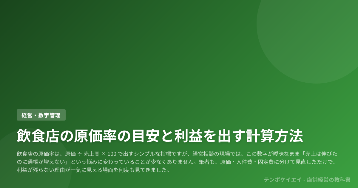 この記事では、原価率の計算式を基礎から整理したうえで、メニュー別と月次の再現しやすい計算例、業態別の実務目安、改善策と価格改定の判断基準までを順番に解説します。