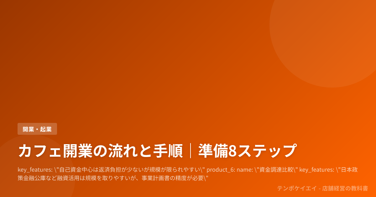 key_features: "自己資金中心は返済負担が少ないが規模が限られやすい" product_6: name: "資金調達比較" key_features: "日本政策金融公庫など融資活用は規模を取りやすいが、事業計画書の精度が必要"